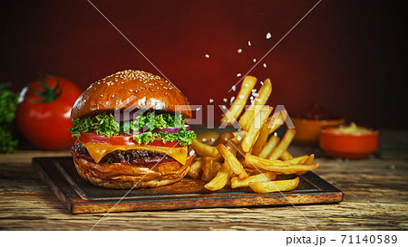 A hearty hamburger and fries, a delicious fast-food meal. The double patty burger with cheese, tomato and lettuce looks very appetizing.