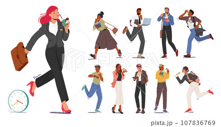 Busy Characters Hurriedly Devour Quick Bites, Juggling Meals Amidst Bustling Streets. A Fast-paced Lifestyle, Vector