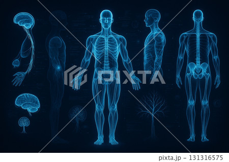 AI generated ultra realistic hologram of human anatomy showing skeleton organs and brain from multiple angles with glowing neon blue futuristic medical science and abstract digital interface