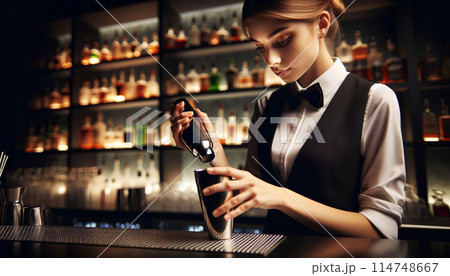 ネオン輝くバーで、プロの女性バーテンダーが魅せるカクテル作り