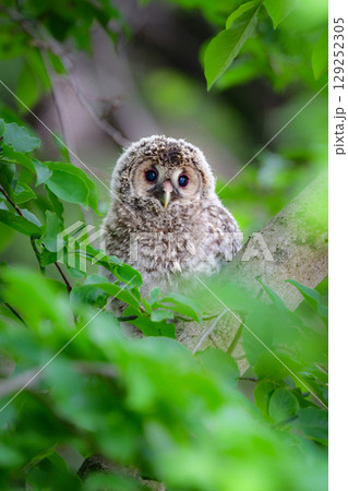 初夏の高原で見られる愛嬌のあるかわいらしい野鳥、フクロウの仲間のトラフズクのひな