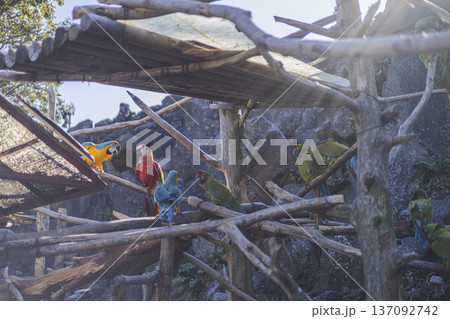 止まり木に集まるカラフルなインコたち 動物園の風景