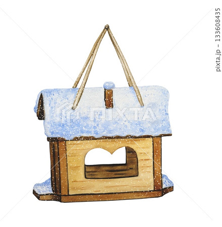 Hand drawn snow covered wooden birdhouse. Watercolor illustration.