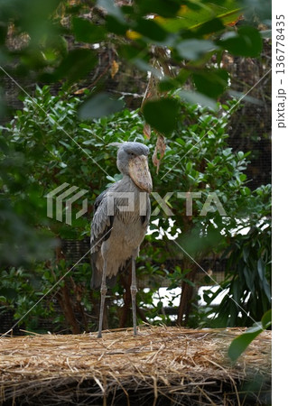 緑に囲まれたハシビロコウの立ち姿 神戸どうぶつ王国