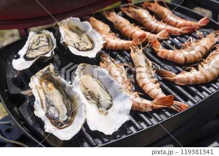 ガスグリルで焼いた岩ガキとエビ バーベキューイメージ