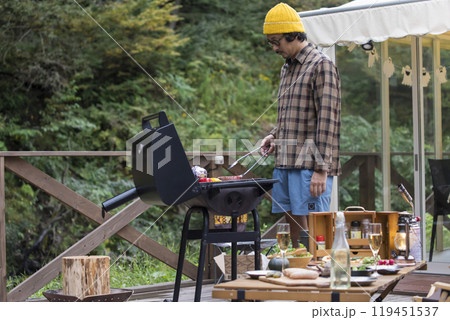 グランピング施設で夕飯の準備をする男性 お父さん