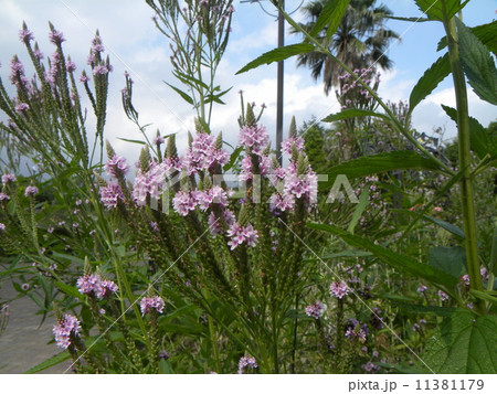 穂状青い花はバーベナ・ハスタータの花と椰子の木