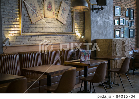 Laptop with stickers stands on a table in a coffee shop. Cafe design. Playing cards on the wall. High quality photo