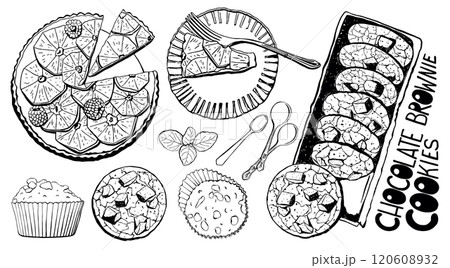 Desserts and sweets, pastry cakes, biscuits sketch