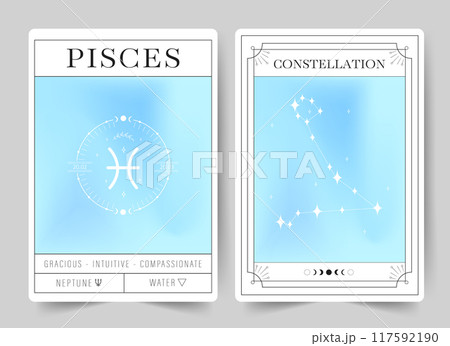Pisces. Witchcraft cards with astrology zodiac sign and constellation. Modern gradient blurred astrology posters in Y2k style. Perfect for tarot readers and astrologers. Vector illustration