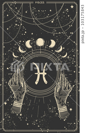 Pisces zodiac sign, astrology boho card, horoscope. Two hands of a witch fortune teller, hand drawn illustration, story card with black background. Vintage vector.