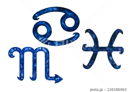 Zodiac watercolor signs of the zodiac of the element of Water: Cancer, Scorpio, Pisces. Blue set of templates of astrological symbols isolated on white background for horoscope, astrology, birth chart
