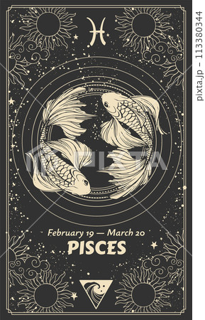 Pisces zodiac sign, vintage hand drawing, graphic modern astrology card, horoscope on black background with sun and moon. Element of water.