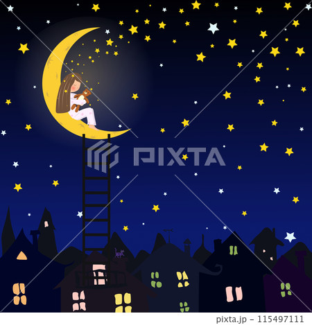 The girl sleeps on the moon in an embrace with a teddy bear. Fairy Baby Drawing for Illustrating Books Websites and Covers. Vector illustration the girl climbed the ladder to the moon and fell asleep