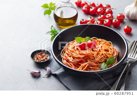 Pasta, spaghetti with tomato sauce in black bowl on grey background. Copy space.