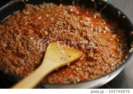 cooking, bolognese sauce, in a frying pan, stirring with a wooden spoon, tomato meat sauce, homemade, no people,
