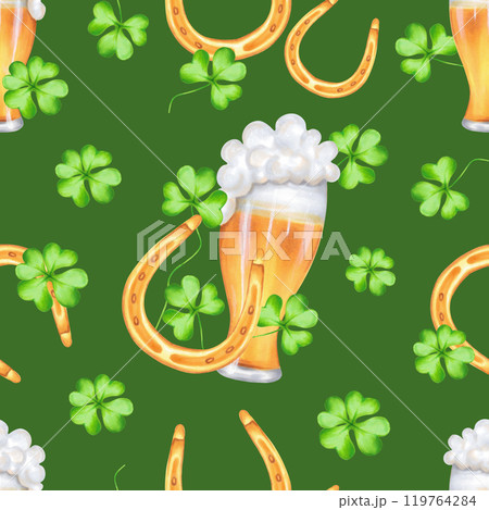 Glass of beer with golden horseshoe and clover petals. Seamless pattern for St. Patrick's Day. Watercolor illustration. Hand drawn isolated art on green background. Symbol of luck, wealth or success