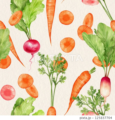 Seamless watercolor pattern with carrots, radishes, and their slices with green tops