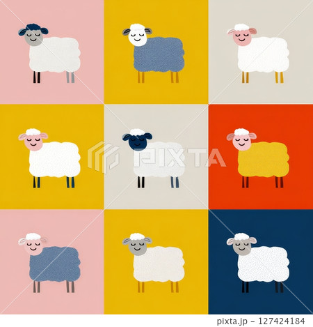 Colorful patchwork of cute cartoon sheep on geometric backgrounds.