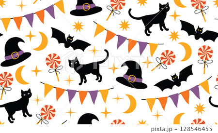 Seamless cute Halloween pattern with lollipop, witch hat, black cat, buntings, tiny stars on white background.