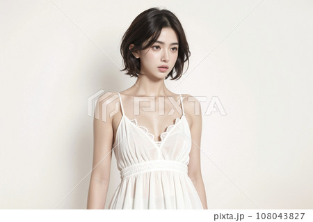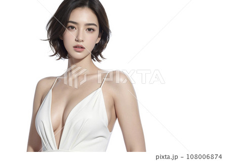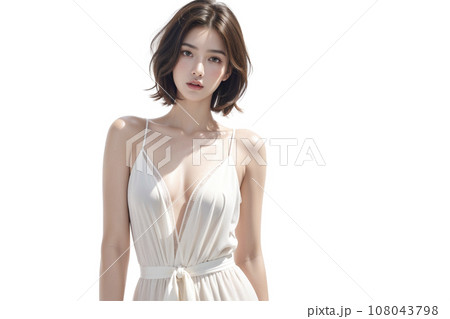 パックリ胸元の白ドレスを着た女性(AI生成画像)