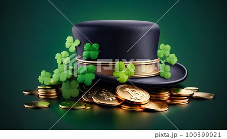 Saint Patrick hat with gold coins and clovers banner. Generative AI