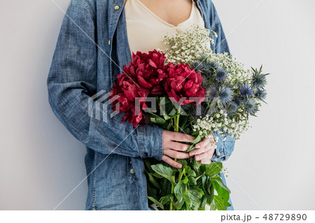 Female hands holding bouquet of peonies, Eryngium and Gypsophila paniculata