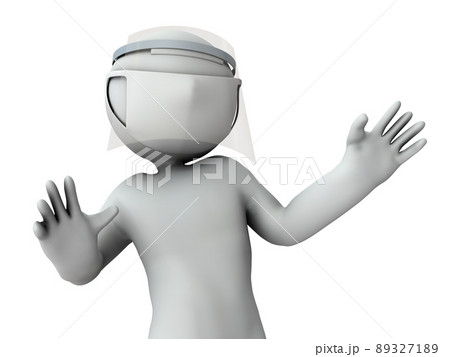 マスクとフェイスガードを付けた人物。感染に対するパニック。後退り、怯える。