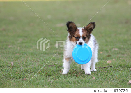 お気に入りのおもちゃで遊ぶ愛犬 パピヨン ドッグラン