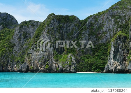 Rocky cliffs covered in lush greenery rise above turquoise waters on a pristine beach in Thailand, showcasing the natural beauty of the region's coastal landscape