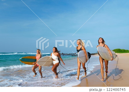 Four women in swimwear walk on sunny beach carrying surfboards. Waves crash. Surf culture, adventure. Ocean in background with clear sky. Group enjoying beach lifestyle. Perfect for surfing.