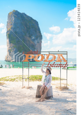 Woman tourist traveling and sightseeing in Krabi, Thailand. happy traveller enjoy on beach at Koh Poda island. summer trip, destination, Southeast Asia Travel, vacation and holiday concept