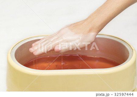 Female hand and parrafin wax bath. Manicure beauty spa salon.