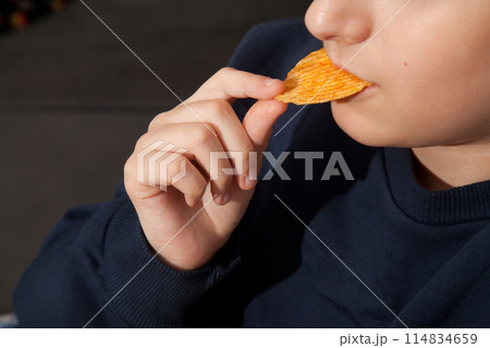 little girl eating potato chips while sitting on the bed, enjoying taste of crisp at home, useless food with spices, seasoned food snack small child, happiness in children's variety goodies vegetable