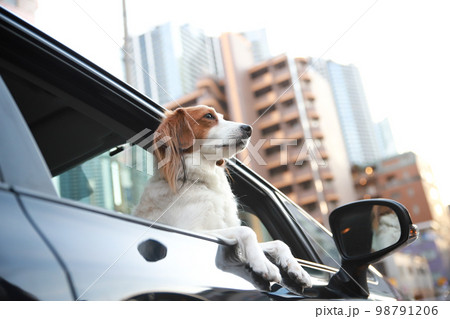 都会のビル群を背景に乗用車の窓から顔を出すコーイケルホンディエ