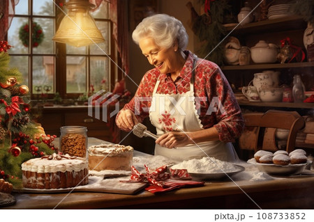 Retro illustration of a cozy kitchen with Grandma making Christmas cakes
