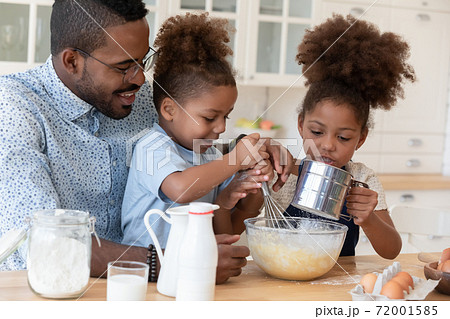 Attentive african daddy showing children how to prepare dough