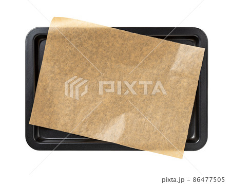 Baking sheet with brown parchment paper isolated on a white background.