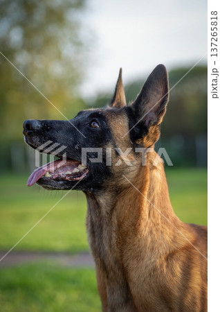 Vertical Head portrait of adult belgian shepherd malinois female with open mouth