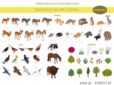 Steppe, prairie, pampas ecosytem, biome isometric set. Vector illustration