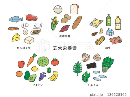 五大栄養素の食品 手描きイラストセット