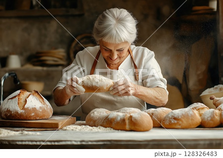 Experienced aged woman in apron working in bakery kitchen, kneading and forming pieces from raw dough