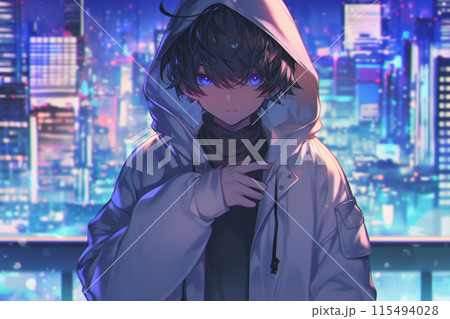 パーカーのフードを被った男性のイラスト(AI生成画像)