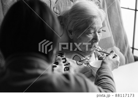 食事を食べさせてもらう高齢女性 在宅介護 老人介護