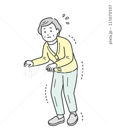 イラスト素材:ケガシリーズ 年配女性が病気や事故、ワクチンの後遺症で手や体の震えに悩む姿