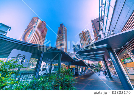 日本の川崎都市景観 武蔵小杉駅やバスロータリー、武蔵小杉駅前のタワーマンション群などを望む