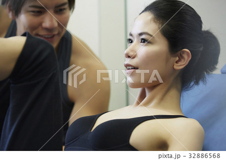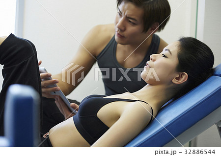 A pretty Asian woman doing work out with assistance from her partner / personal trainer at a gym