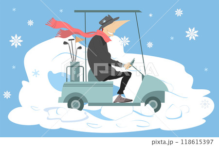 Golfer man rides the golf cart illustration. Winter. Snow. Golfer man in the hat and scarf going to play golf in the golf cart. Isolated on white