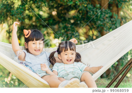 ハロウィンの格好でハンモックに座る子供達