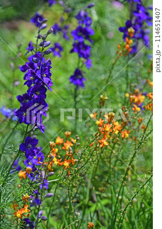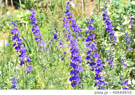 青いデルフィニウムの花が咲いています。学名はDelphiniumです。